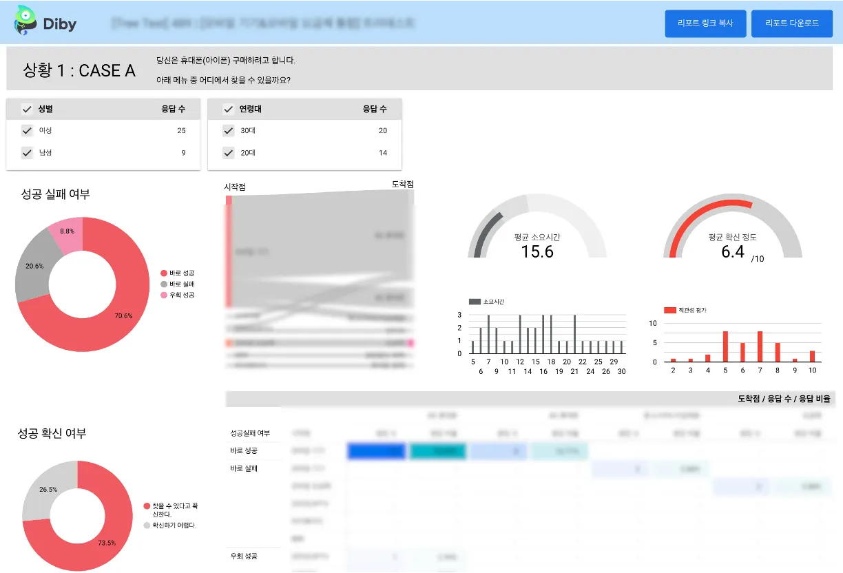 메뉴 시작점과 도착점을 표시하고, 평균 소요 시간, 정답 확신 여부, 시작점 대비 도착점 교차분석을 제공해요.