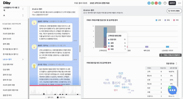 FGD 대화에서 특정 키워드와 함께 언급된 키워드를 감정분석과 함께 확인할 수 있어요.