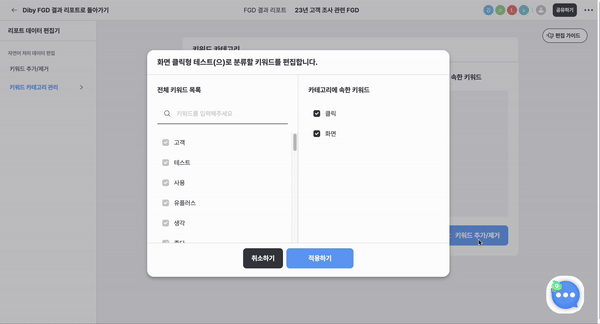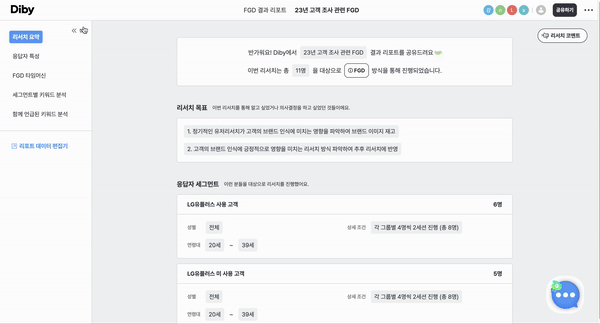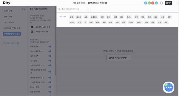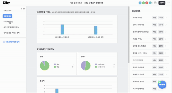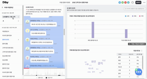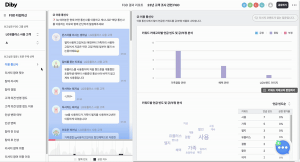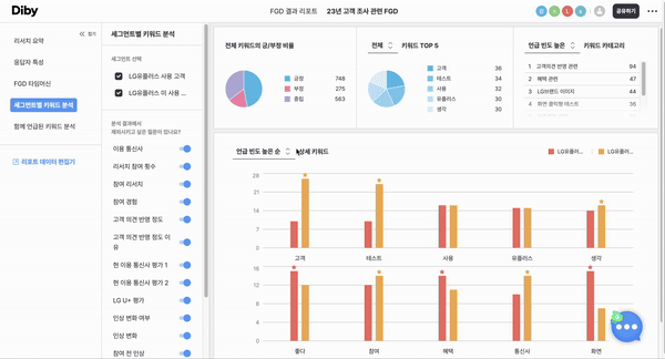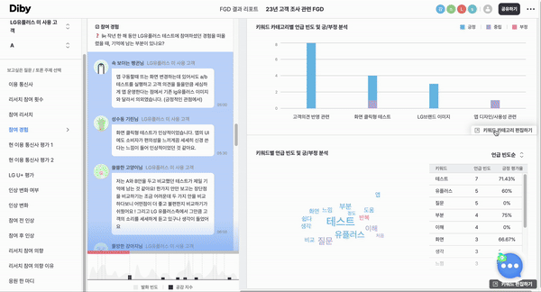 두 개 이상의 세그먼트와 FGD를 진행했다면, 각 세그먼트에서 어떤 키워드가 어느 정도의 빈도로 언급되었는지 한눈에 확인할 수 있어요.