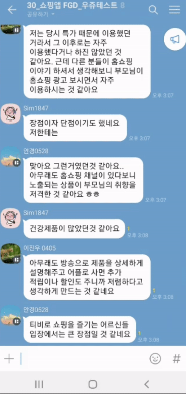 FGD는 특정 세그먼트의 응답자 5~6명이 그룹 채팅을 통해 정해진 아젠다에 대해 토론하는 방식으로 진행해요.