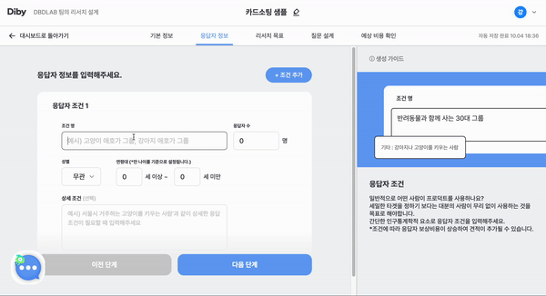 응답자 조건을 입력해 주세요. 조건은 2개 이상 추가하실 수 있고, 여기서 설정하신 조건대로 결과 리포트에서 필터로 활용하실 수 있어요.